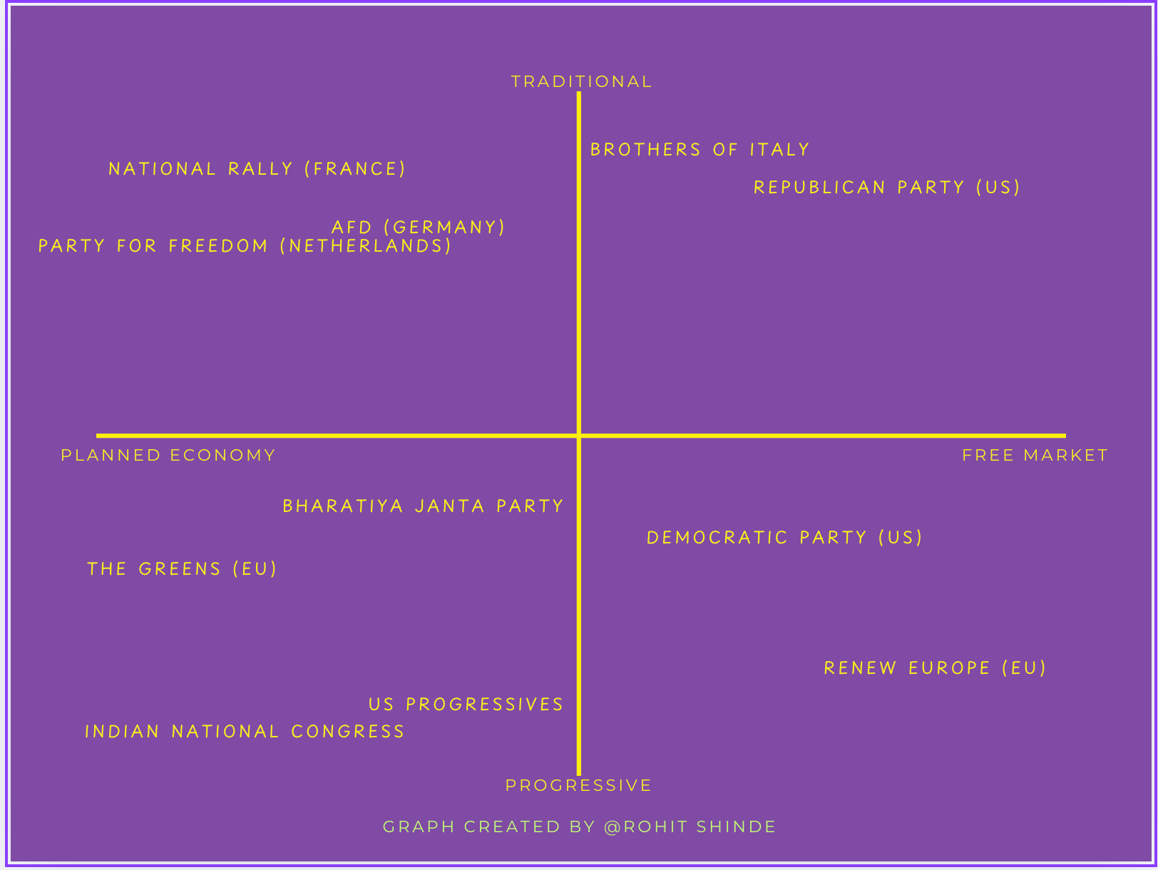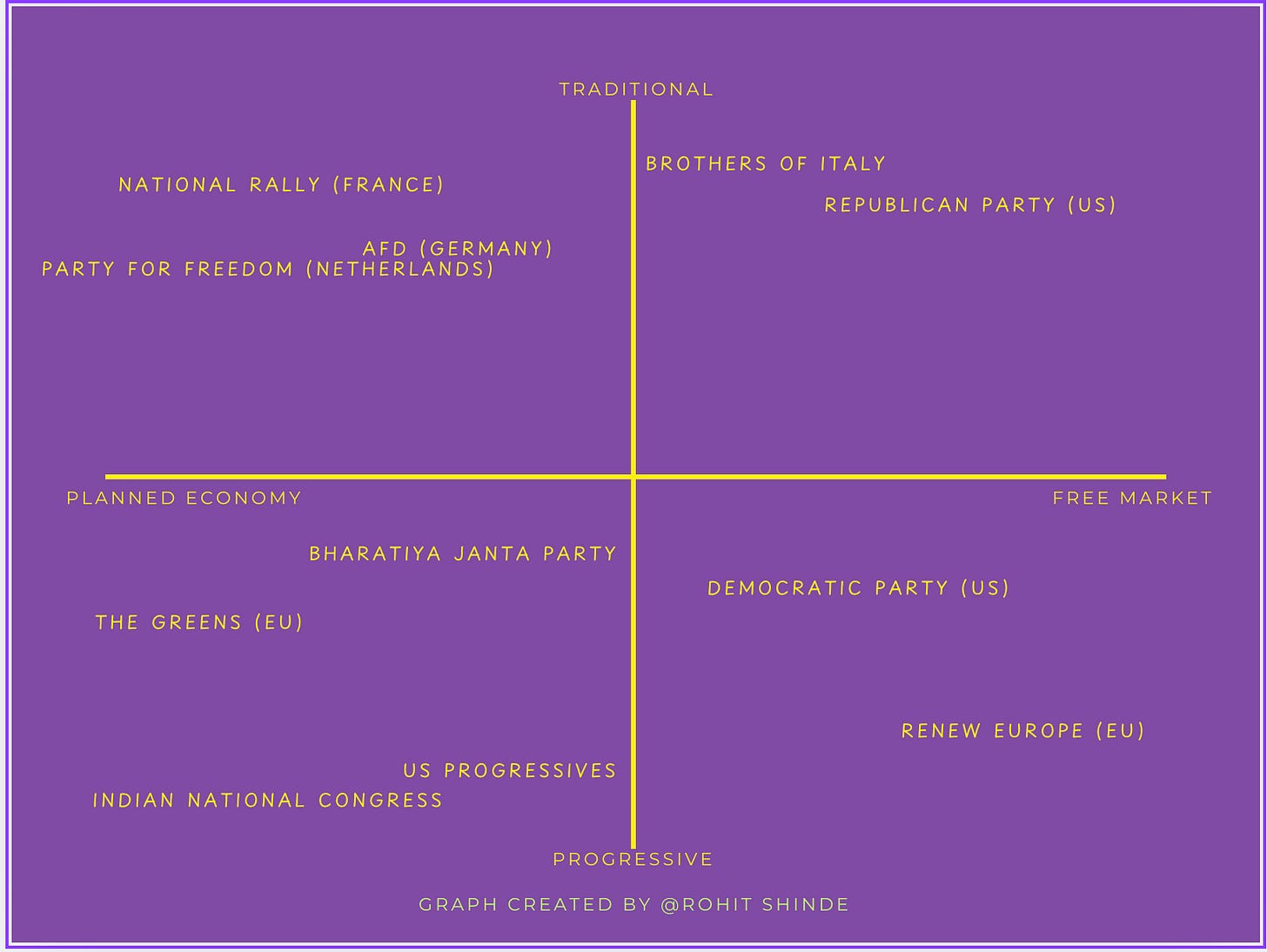 I have created a graph here, where the X-axis goes from a Planned Economy to a Free Market and the Y-Axis goes from Progressive to Traditional. I put in some European parties in the graph where I understood them to be. As you can see, the BJP and the INC are firmly in the lower left quadrant according to their economic and social policies. I can’t call BJP free market without abusing the term.
